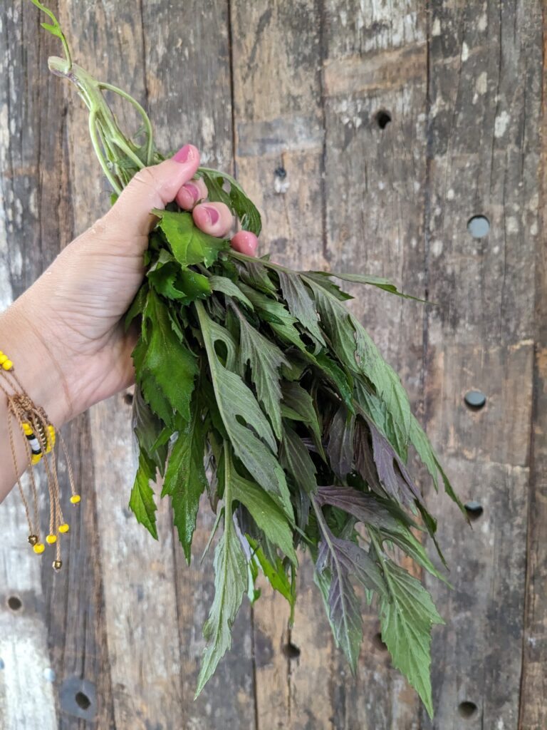 Muito aromática, esta PANC possui entre 50 e 1,20 de altura, com folhas profundamente recortadas, revertidas com pequenos pelos, de coloração verde na face superior e roxa na parte inferior. As flores são em forma de pincel, na cor creme ou rosa.